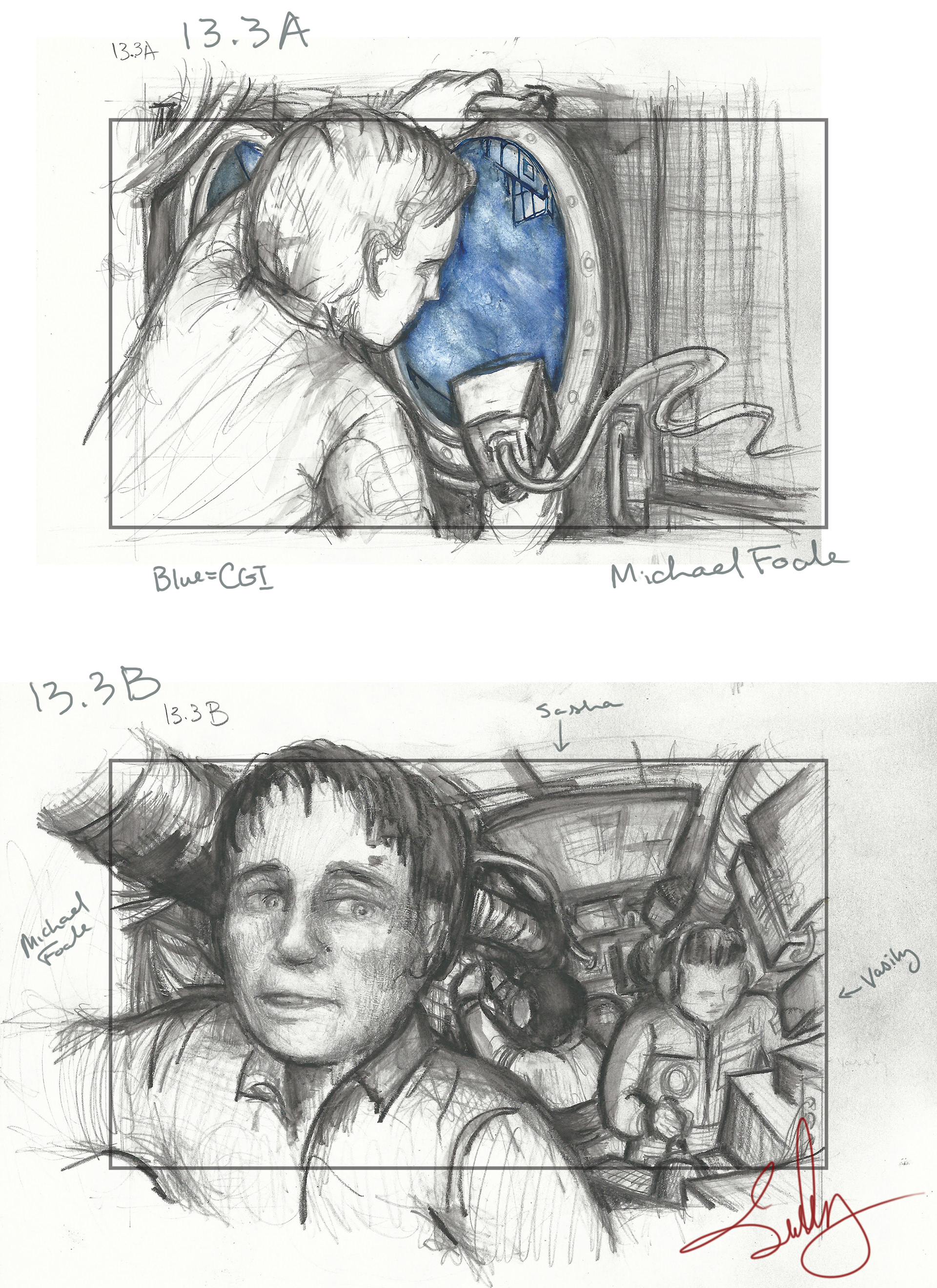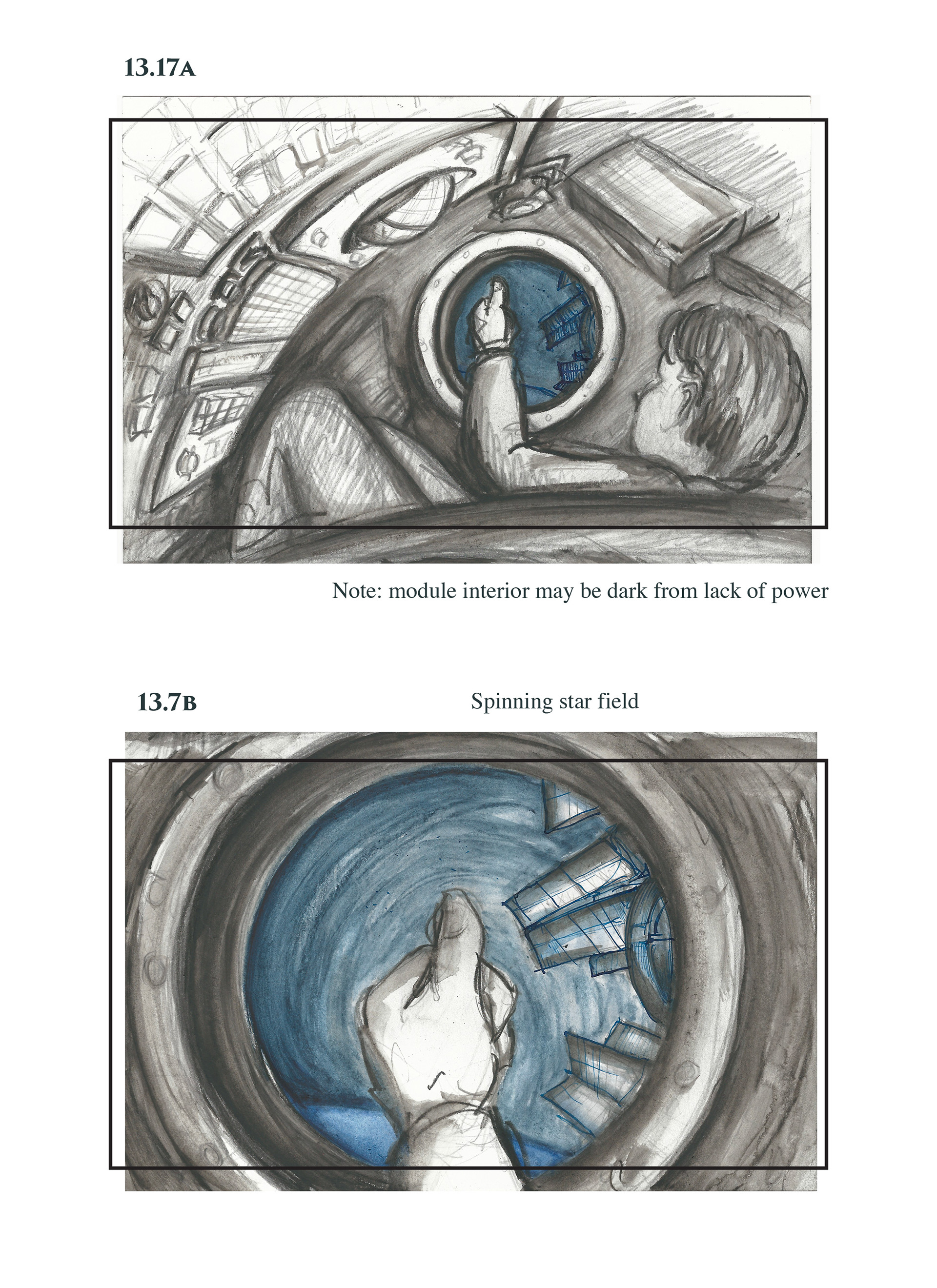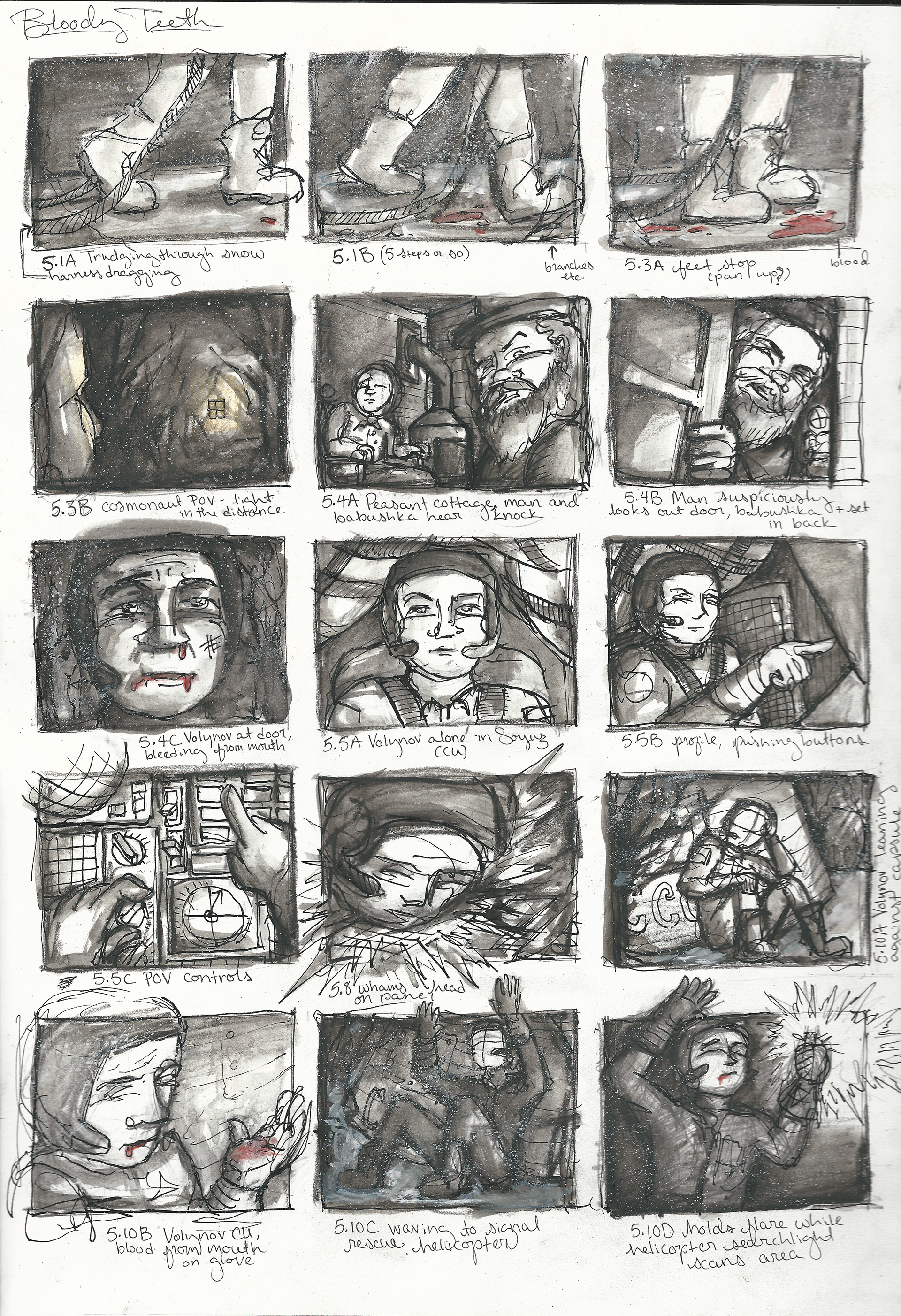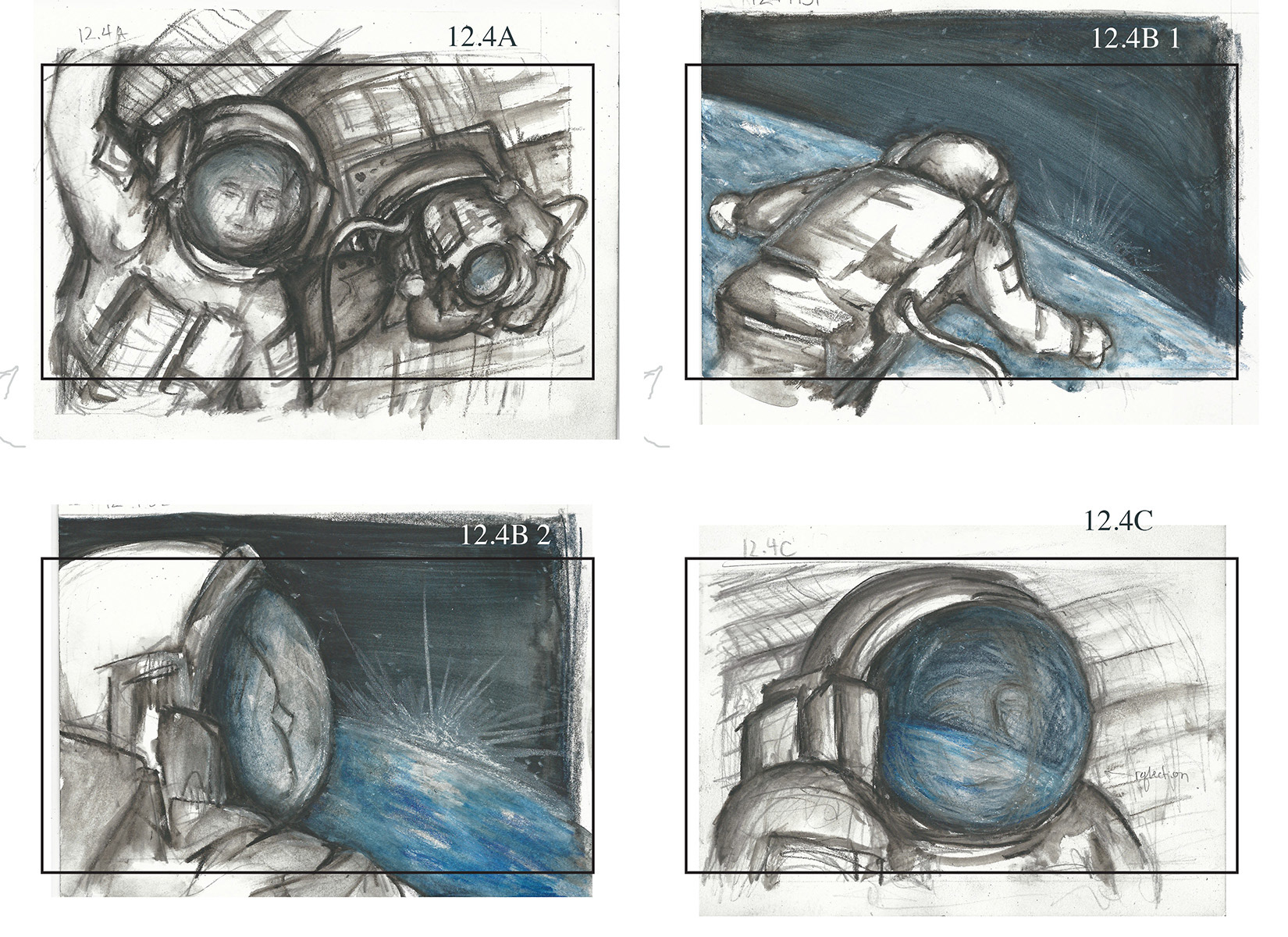 Storyboard drawings for recreation scenes in television series, "Secret Space Escapes," produced by ITV America for Science Channel