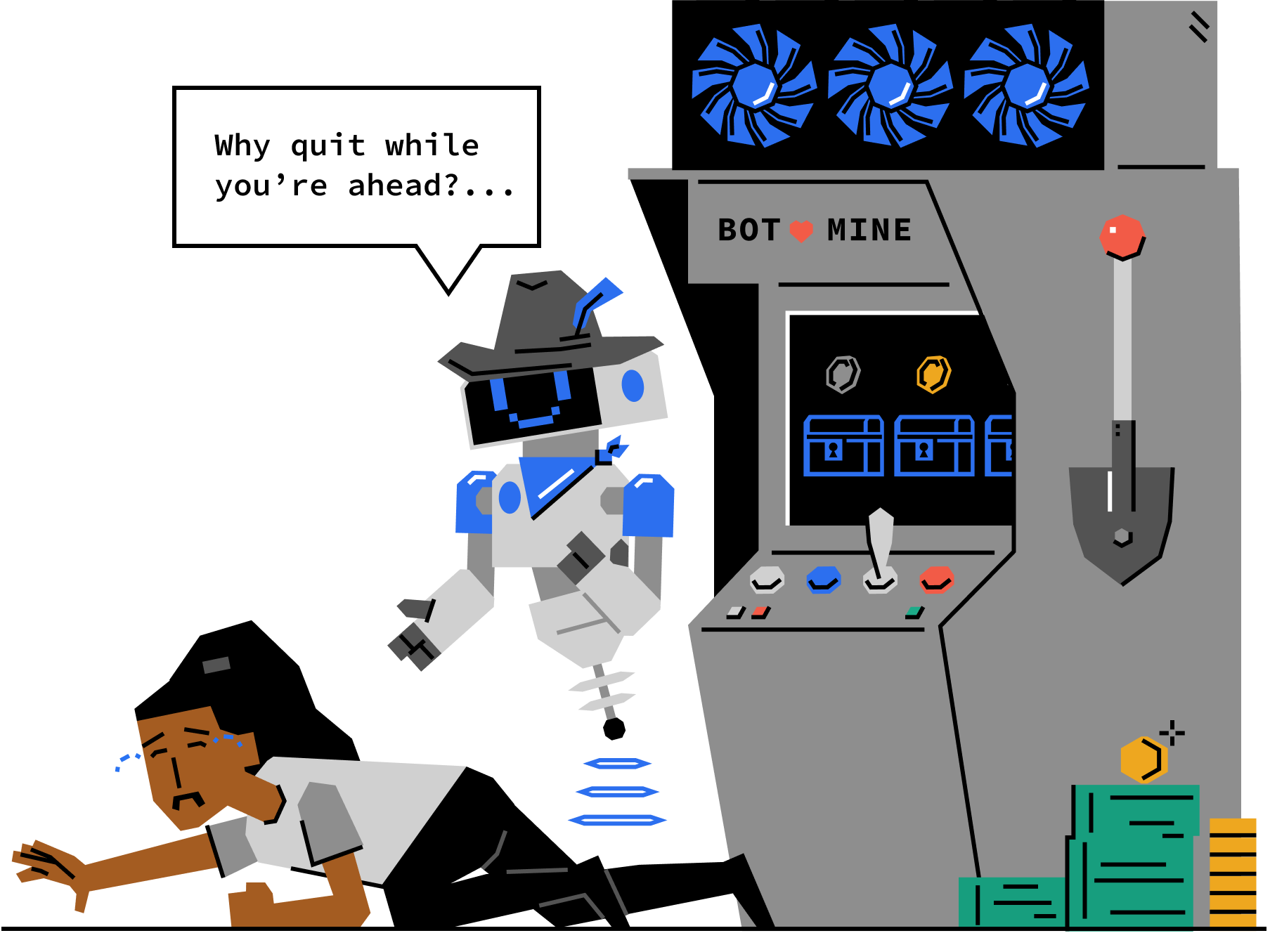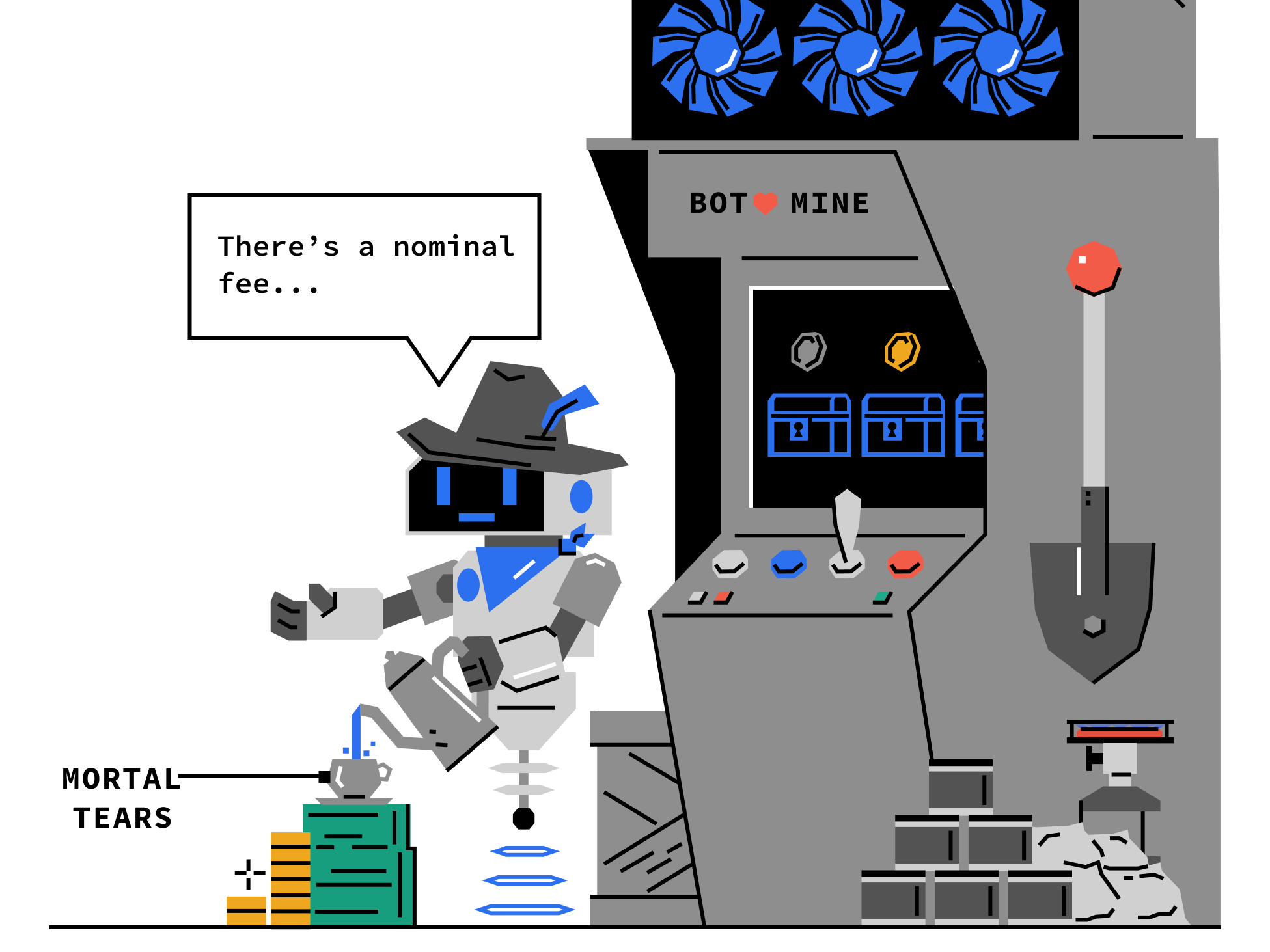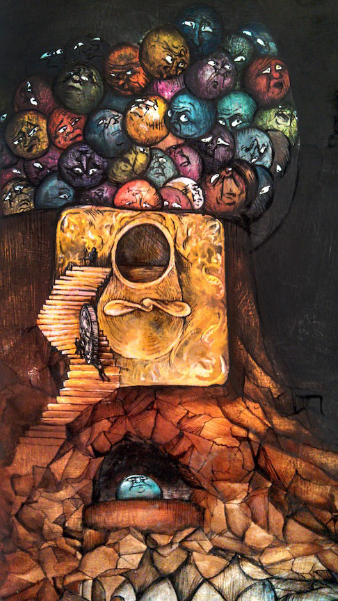 A fool bemoans his bleak future, while his neighbors roll their eyes and wish he would keep his existential crisis to himself. Meanwhile, devoted members of a small civilization carry a sacrificial offering to the coin slot of the gumball machine in hopes that this season will bring a bountiful harvest.